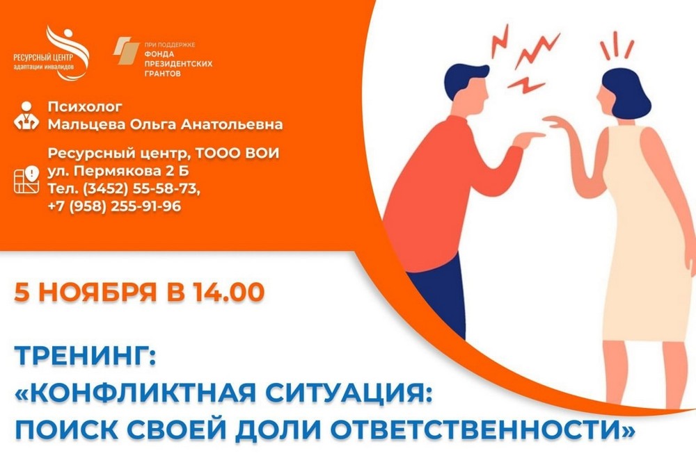 05 ноября в 14.00 в Ресурсном центре адаптации инвалидов (ул. Пермякова, 2б) состоится тренинг "Конфликтная ситуация: поиск своей доли ответственности". Проведет тренинг опытный психолог, кандидат психологических наук Ольга Анатольевна Мальцева....