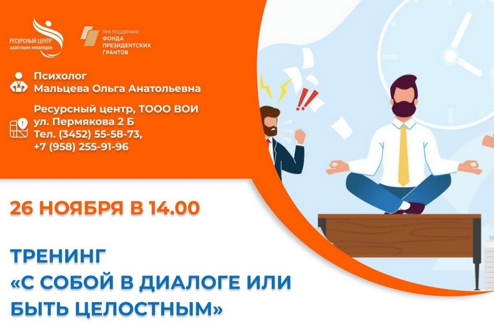 26 ноября в 14.00 в Ресурсном центре адаптации инвалидов (ул. Пермякова, 2б) состоится тренинг "С собой в диалоге, или Быть целостным." Проведет тренинг опытный психолог, доцент, кандидат психологических наук Ольга Анатольевна Мальцева. На тренинге...